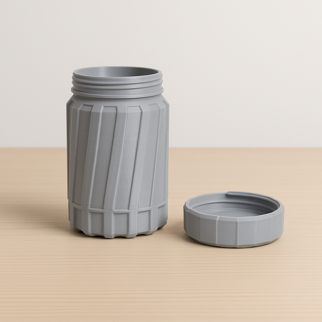 Recipiente prático impresso em 3D, com tampa de rosca segura. Ideal para guardar parafusos, pregos, pequenas peças ou acessórios.
